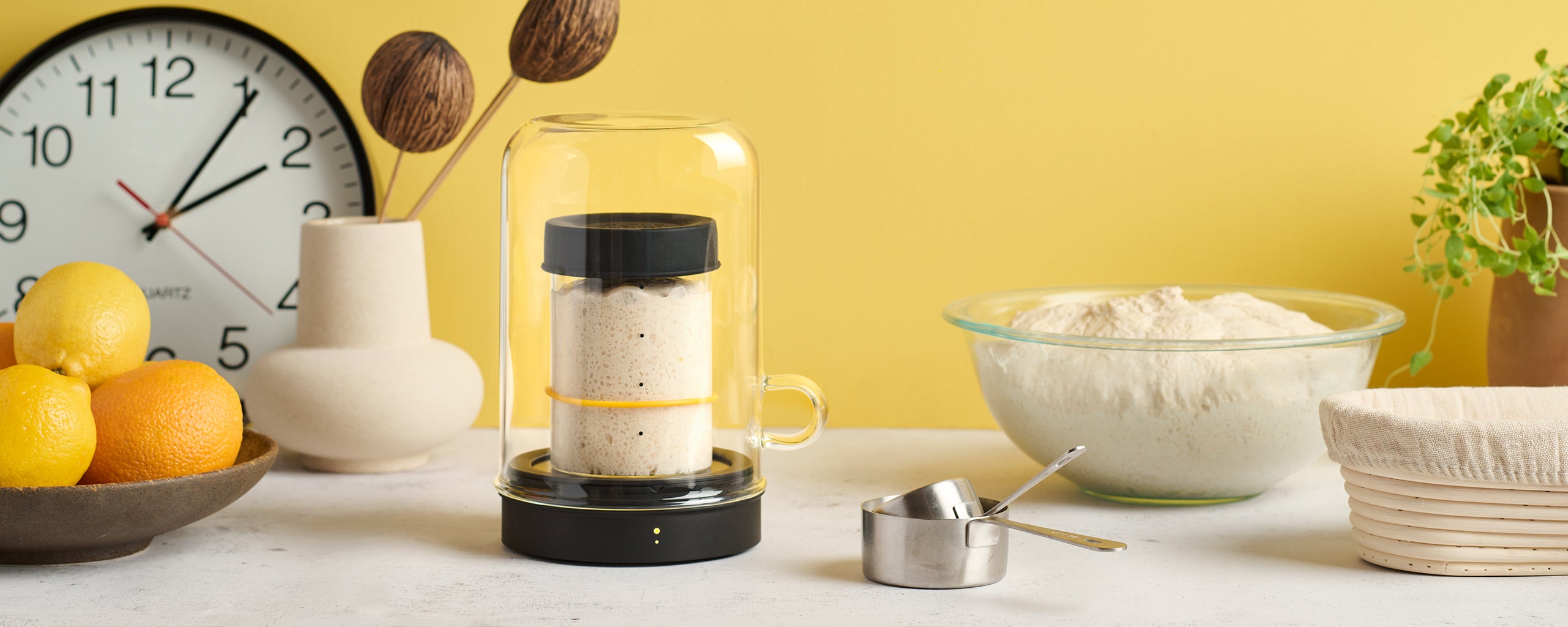 Goldie elegantly warms your starter jar, bringing your starter up to the “Goldilocks Zone" of 75-82ºF / 24-28ºC - not too hot, not too cold.
